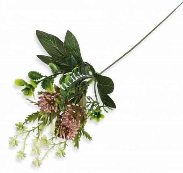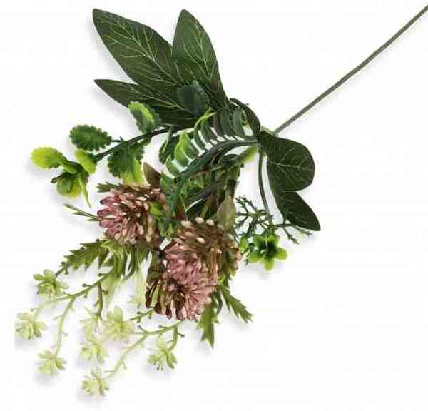 Gałązka jest estetycznie rozkrzewiona, co nadaje kompozycjom lekkości i naturalnego wyglądu. Znajdują się na niej starannie wykonane kwiatostany oraz charakterystyczne liście ostu z lekko gumowego plastiku, które wyglądają bardzo realistycznie. Całość uzupełniają dekoracyjne liście z materiału.